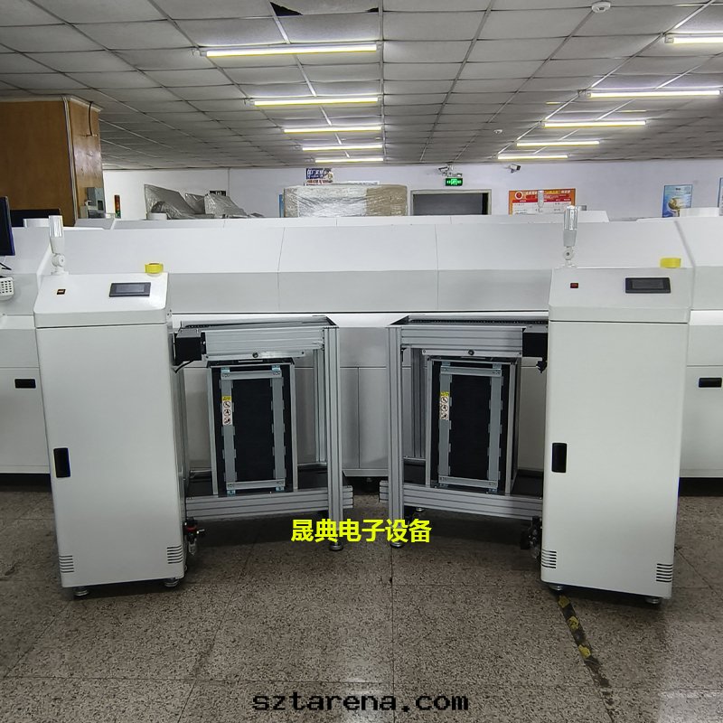 SMT全(quán)自(zì)動(dòng)收(shōu)闆機(jī)(Unloader)PCB下(xià)闆機(jī),SMT收(shōu)料機(jī),PCB下(xià)料機(jī),廣泛應(yìng)用(yòng)于(yú)SMT生(shēng)産線(xiàn)的末(mò)端,将前(qián)面(miàn)設備傳送过(guò)来(lái)的闆逐一(yī)收(shōu)进料箱(xiāng)內(nèi)而(ér)實(shí)現(xiàn)収闆功能(néng),它(tā)的収闆闆動(dòng)作(zuò)是(shì)通(tòng)过(guò)接收(shōu)前(qián)面(miàn)設備信(xìn)号(hào)後(hòu)做出(chū)的動(dòng)作(zuò),若Unloader機(jī)已全(quán)部(bù)收(shōu)完闆則它(tā)又会(huì)反(fǎn)制前(qián)面(miàn)設備停止工作(zuò),並(bìng)發(fà)出(chū)声光(guāng)報警,它(tā)也(yě)可(kě)以(yǐ)为(wèi)某一(yī)个(gè)單獨的SMT設備實(shí)現(xiàn)收(shōu)闆功能(néng)。与之(zhī)对(duì)應(yìng)的是(shì)PCB全(quán)自(zì)動(dòng)上(shàng)闆機(jī),位(wèi)于(yú)SMT生(shēng)産線(xiàn)的前(qián)端。